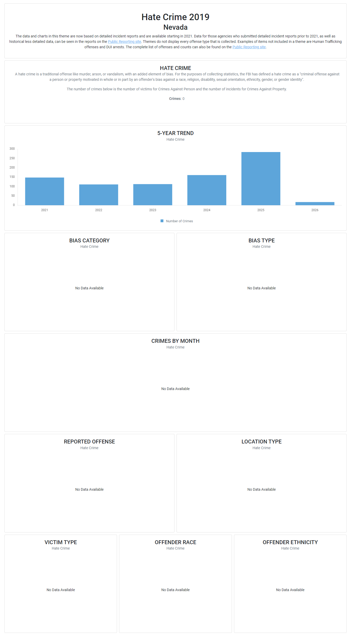 The data and charts in this theme are now based on detailed incident reports and are available starting in 2021. Data for those agencies who submitted detailed incident reports prior to 2021, as well as historical less detailed data, can be seen in the reports on the Public Reporting site. Themes do not display every offense type that is collected. Examples of items not included in a theme are Human Trafficking offenses and DUI arrests. The complete list of offenses and counts can also be found on the Public Reporting site.